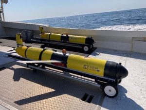 Figure 2: The Slocum glider that conducted a survey in the central Gulf of Maine equipped with a conductivity-temperature-depth instrument, chlorophyll fluorometer and turbidity instrument and the DMON passive acoustic monitoring instrument.