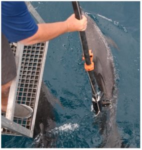 Figure 1: TADpole being positioned around the dorsal fin of an Atlantic spotted before tag deployment.