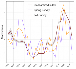 In 2012, the Secretary of Commerce declared a fishery failure and an economic disaster for the New England groundfish fishery. After decades of overfishing from foreign and domestic fleets, rebuilding plans were implemented in the 1990s and a precautionary management system was implemented in 2010. The Annual Catch Limit system substantially reduced allowable catch (e.g., the allowable catch for Gulf of Maine cod decreased 96% over five years, 2011-2015). However, despite these management efforts that strictly adhered to scientific advice, overfishing appears to be continuing for Gulf of Maine cod, Gulf of Maine and southern New England yellowtail flounder, and Georges Bank winter flounder. Several factors contribute to uncertainty in groundfish stock assessments and fishery management, including under-reported catch, decreased productivity from climate change, mortality of fish released from fishing gear, and surveys with limited spatial resolution. The development of standardized fishery catch rates are proposed to provide fishermen’s perceptions of groundfish availability and to help improve stock assessments and fishery management of New England groundfish.