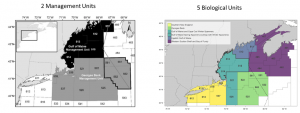 Figure 2: Left panel: Current boundaries for the two U.S. Atlantic cod management units – Gulf of Maine (black polygons) and Georges Bank (gray polygons). The individual polygons are statistical areas, used to aggregate fishery catch data. Right panel: Biological stock structure of cod in the Gulf of Maine and adjacent areas.