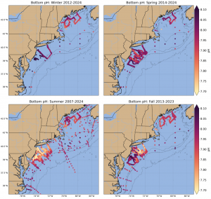 Figure 3: Seasonal bottom pH on the U.S. Northeast Shelf plotted from available quality-controlled vessel- and glider-based datasets. Winter (Dec, Jan, Feb) data availability: 2012-2024; Spring (Mar, Apr, May) data availability: 2014-2024; Summer (Jun, Jul, Aug) data availability: 2007-2024; and Fall (Sept, Oct, Nov) data availability: 2013-2023.