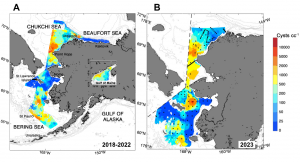 Figure 5: Alexandrium catenella cyst concentrations (0-3 cm) from A) all samples collected during 2018-2022 and B) from 2023 research cruises. Data collected from 2023 B) reveals a new cyst hotspot off Nome, AK.