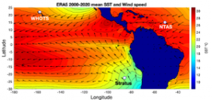 The Ocean Reference Station (ORS) project provides sustained observations at three stations in a key region of the ocean – the trade wind region – using surface moorings to collect accurate observations at the sea surface and in the water column. The project contributes to the long-time series: 24 years of sampling at Stratus and 20 years at WHOTS.